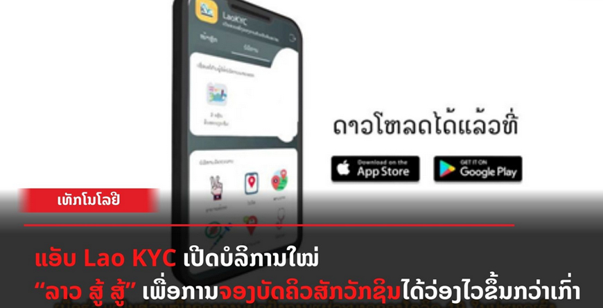 ໃນວັນທີ 5 ກໍລະກົດ, ກະຊວງເຕັກໂນໂລຊີ ແລະ ການສື່ສານ ຮ່ວມກັບ ກະຊວງສາທາລະນະສຸກ ໄດ້ເປີດນຳໃຊ້ ບໍລິການໃໝ່ “ລາວ ສູ້ສູ້” ໃນແອັບພລິເຄເຊິນ Lao KYC ເພື່ອອຳນວຍຄວາມສະດວກໃນການລົງທະບຽນ ແລະ ຈອງບັດຄິວເພື່ອສັກວັກຊິນໄວ້ລ່ວງໜ້າ ແຫຼ່ງຂໍ້ມູນ: https://laox.la/techonology/13405/